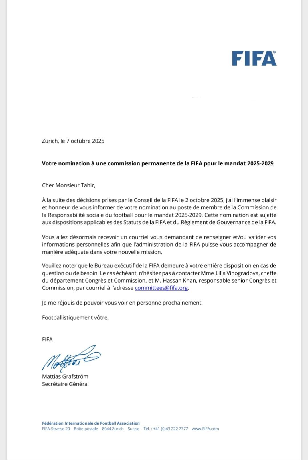 nomination de membre de la Commission de la Responsabilité Sociale du Football de la FIFA
